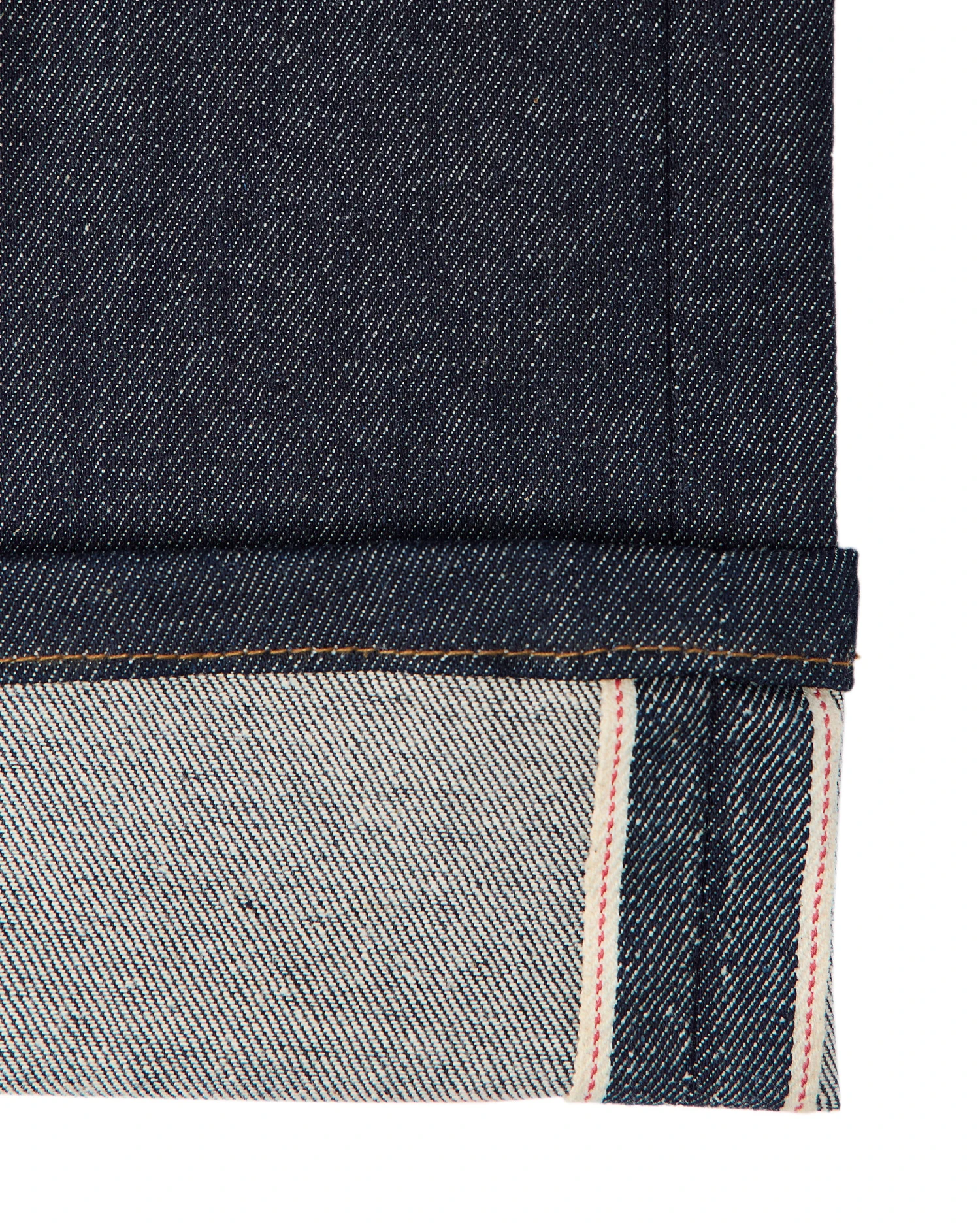 Selvedge denim is woven on traditional, narrow shuttle-looms with one continuous weft thread passed back and forth across the loom in a wooden shuttle. Easily identified by its characteristic red and white selvedge edge, showing on the outside leg seam.