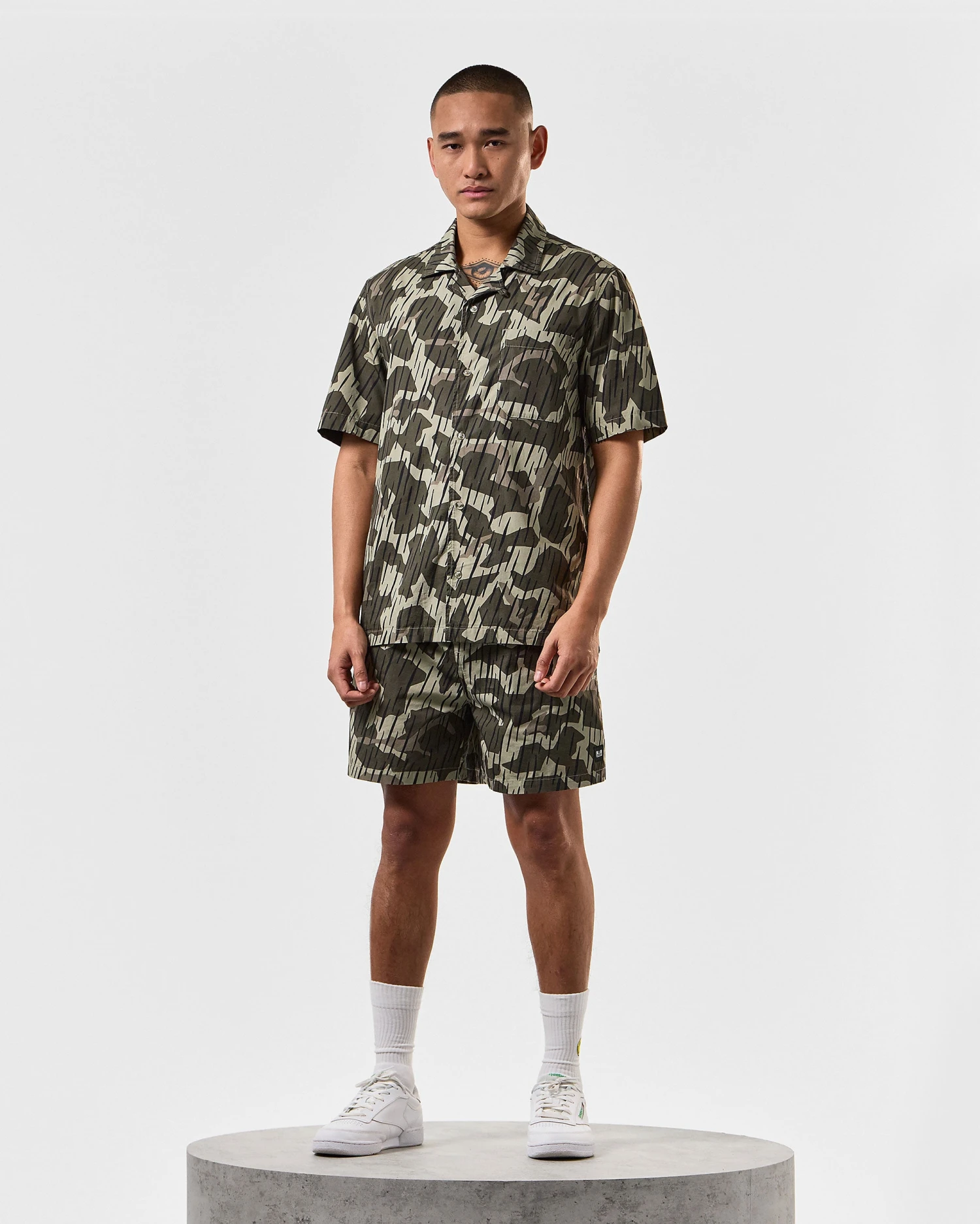 Summer shorts made from 100% woven Cotton and screen printed with our own disruptive rain camo print.