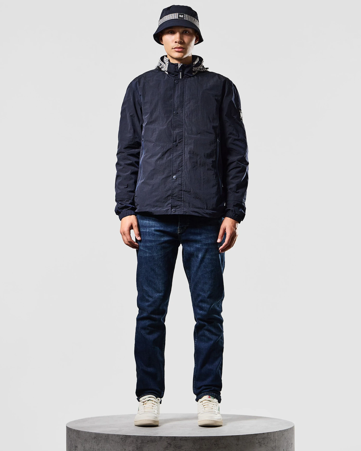 Parachute Jacket made from lightweight woven 100% Nylon with a lightly reflective surface. Treated with a additional DWR (Durable Water Repellent) coating.