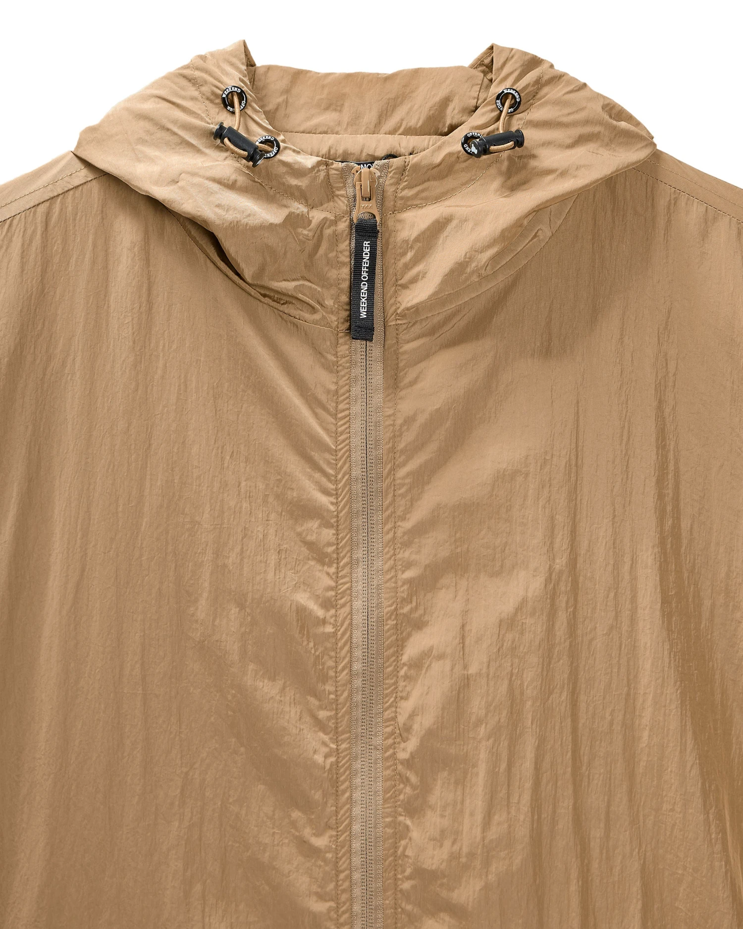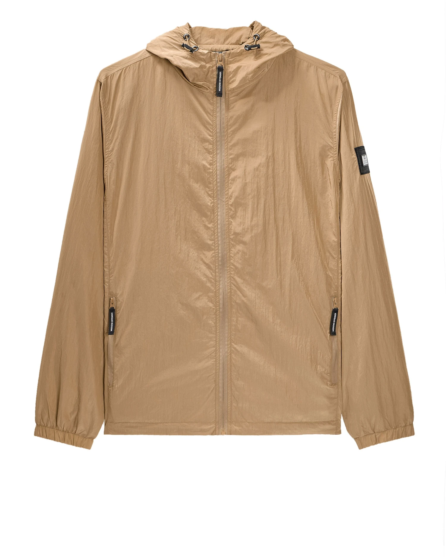 A staple WO jacket made from lightweight high density woven 100% Nylon parachute style fabric with a lightly reflective surface. Treated with an additional DWR (Durable Water Repellent) coating.